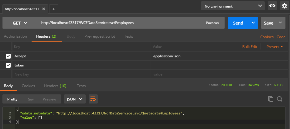 The parameter to the GetMagicKey function is passed in as a URL param, returning the static secret for the service. If this is not included on the request to Employees, then the service returns an empty collection. If it is included, we get back all the employees (subject to whatever other query interceptors apply to that collection). I tried to apply the query interceptor to every collection with one method, but alas I had no luck (Tried a wildcard in the annotation, crash... tried multiple annotations with a Func<object,bool> return type, crash). There may be a way to do it, but I think I've beat this horse enough.